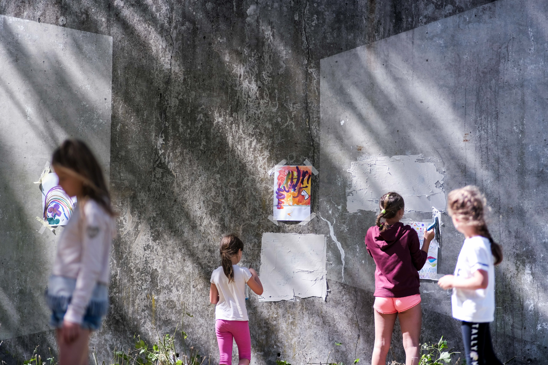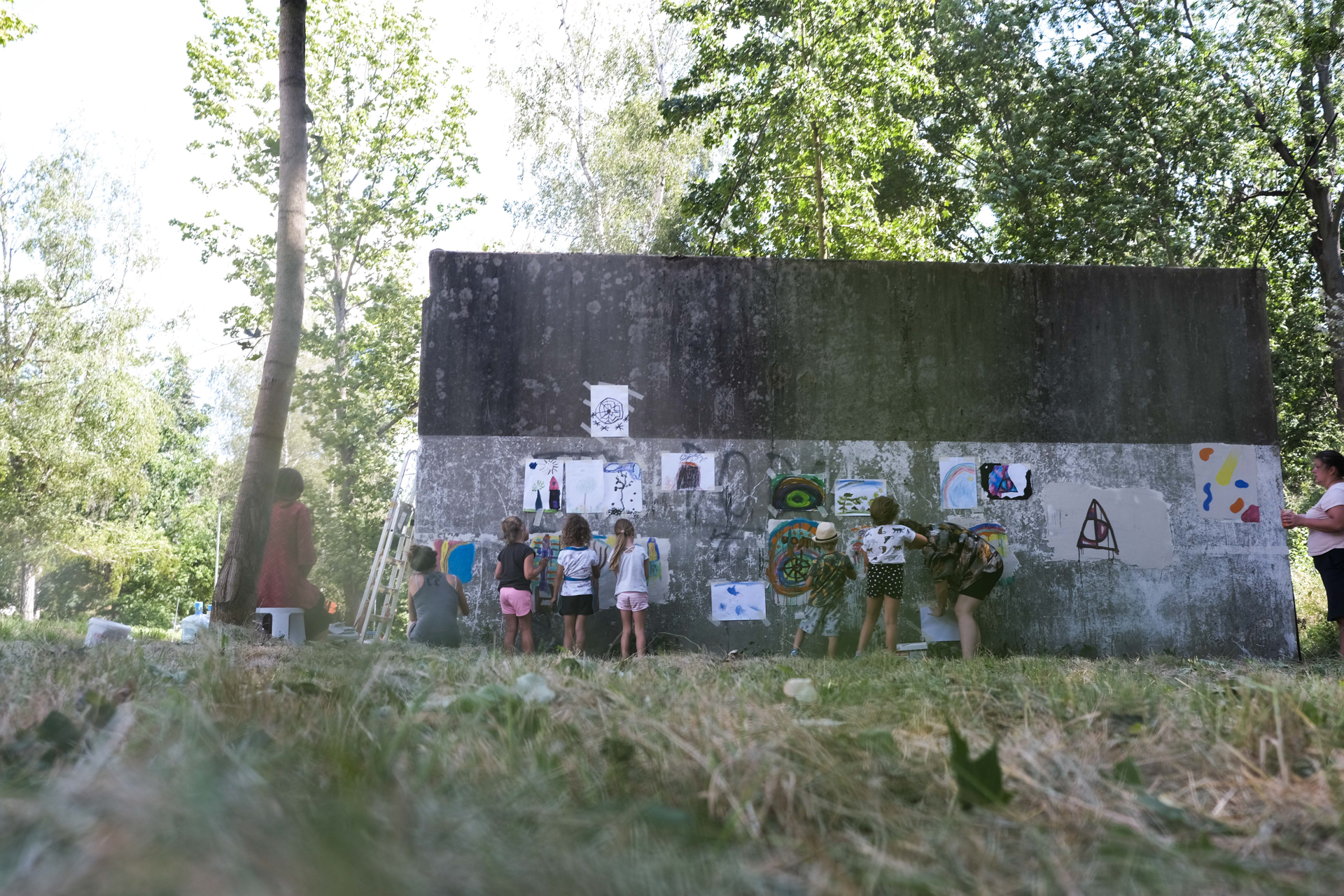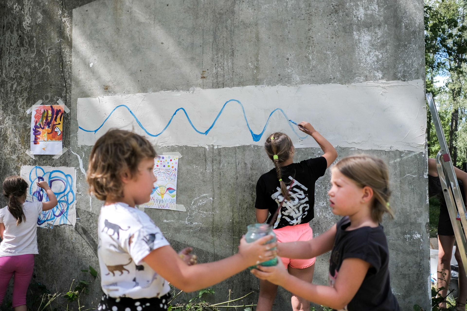 Workshop proběhl v rámci příměstského tábora pro děti ve věku 5-14 let, který organizovala GAMPA jako rozšíření Festivalu Tvárnost paměti. Společná freska vznikala během jednoho dne v Pardubicích na opuštěné zdi poblíž cyklostezky. Skicovali jsme za hezkého počasí v plenéru. Děti si v příjemném stínu rozmíchaly barevné pigmenty a vyzkoušely si práci se zednickými natahováky i špachtlemi. Výsledná malba je pestrá na motivy i barvy a je dále zanechána venkovním podmínkám i zubu času.