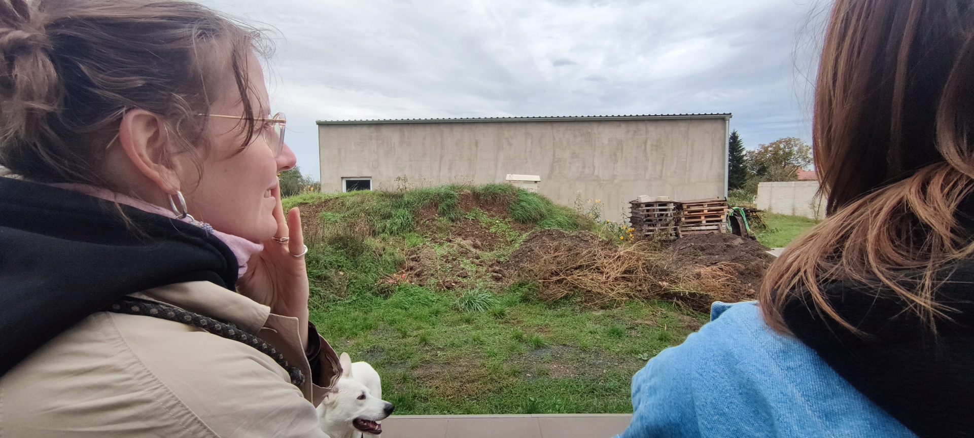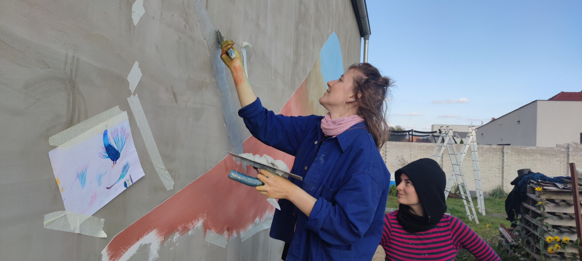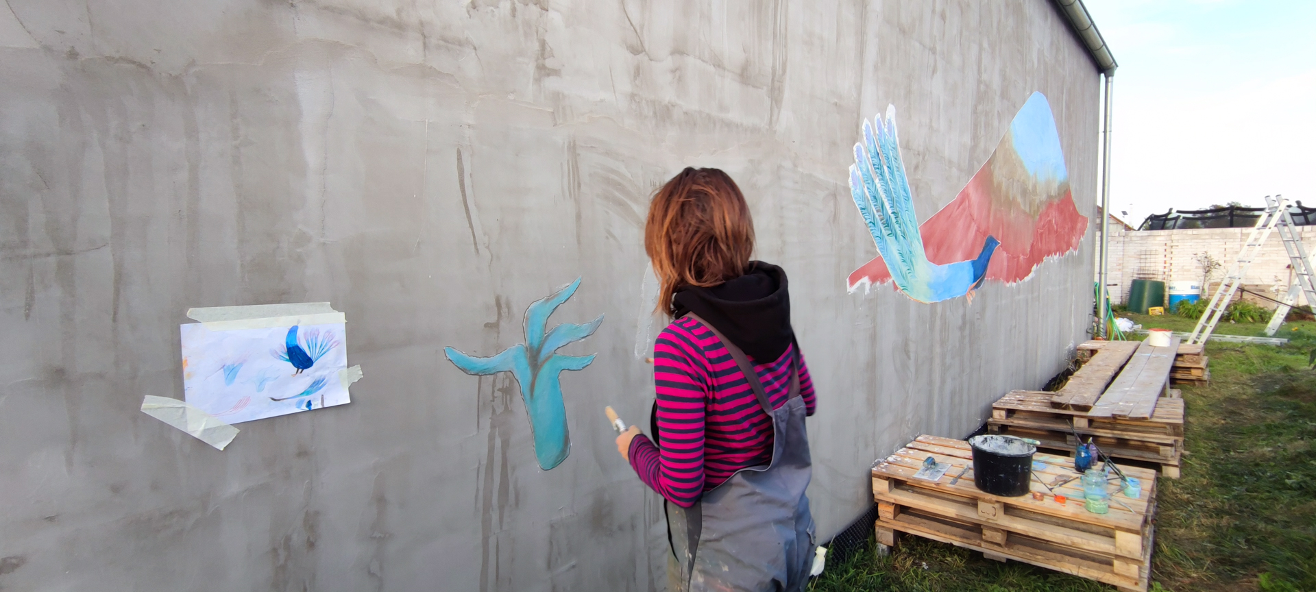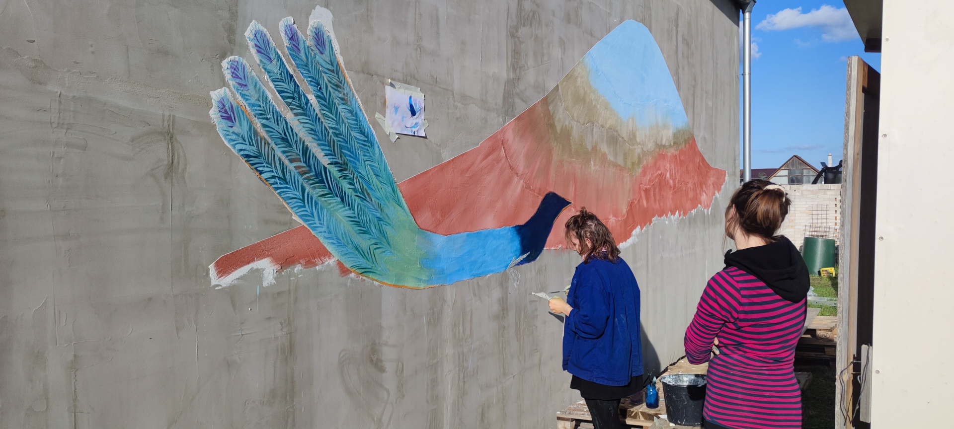Zabydlování dostavěného domku vnuklo Laďce nápad, že by si přála dívat se na umění, které by ji rozradostňovalo při pohledu ven z oken. Vznikl nápad pojednat plochu zdi sousední švagrovy dílny a když i ten souhlasil, přijely jsme skicovat. Laďka se velkoryse věnuje místní kultuře- udržuje tradici lidových krojů a zpěvů, vede místní soubor a práce má nad hlavu. Jako inspiraci jsme dostaly k nahlídnutí několik motivů z místních lidových maleb a vzorů a zaujal nás obrazec stylizovaného páva. Paví péro si strážničtí muži dávali za klobouk, když šli na vojnu jako formu ochrany a památky na svůj domov. Páv teď střeží i domov Laďky.