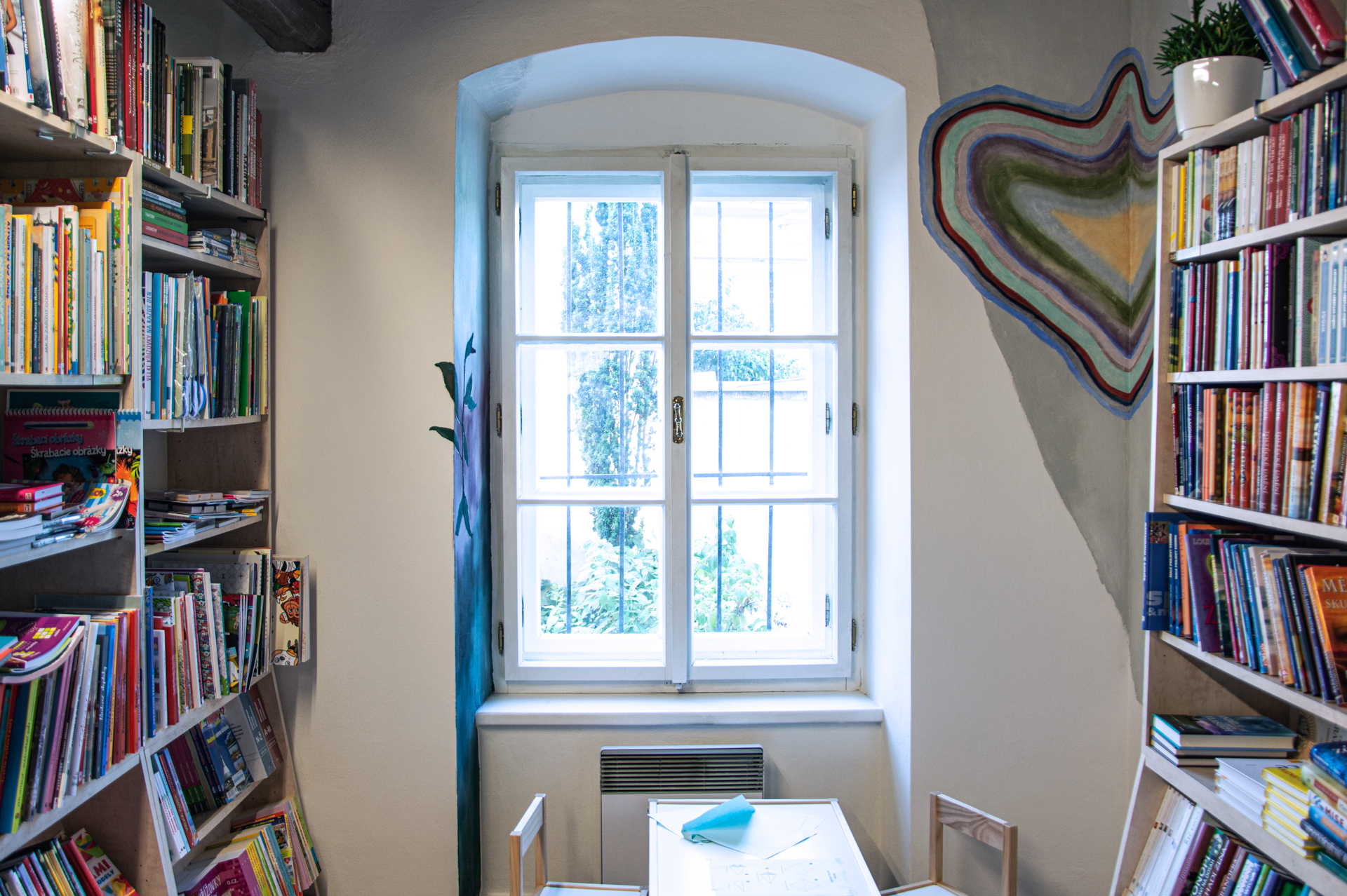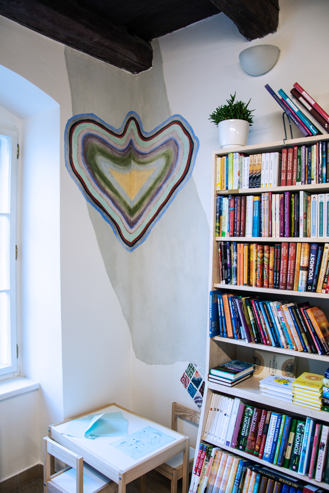 Malba do útulného knihkupectví, které s velkou radostí a houževnatostí vede Radka Lehečková. Kromě samotného výběru kvalitní literatury se zde lidé schází na přednášky, čtení a koncerty. Prostor je živým bodem na mapě kulturního dění Šternberka. Naše freska na Vás vykoukne v ezoterickém koutku a při výhledu do zahrady.