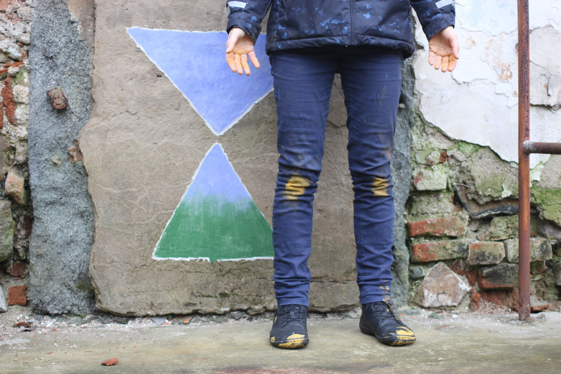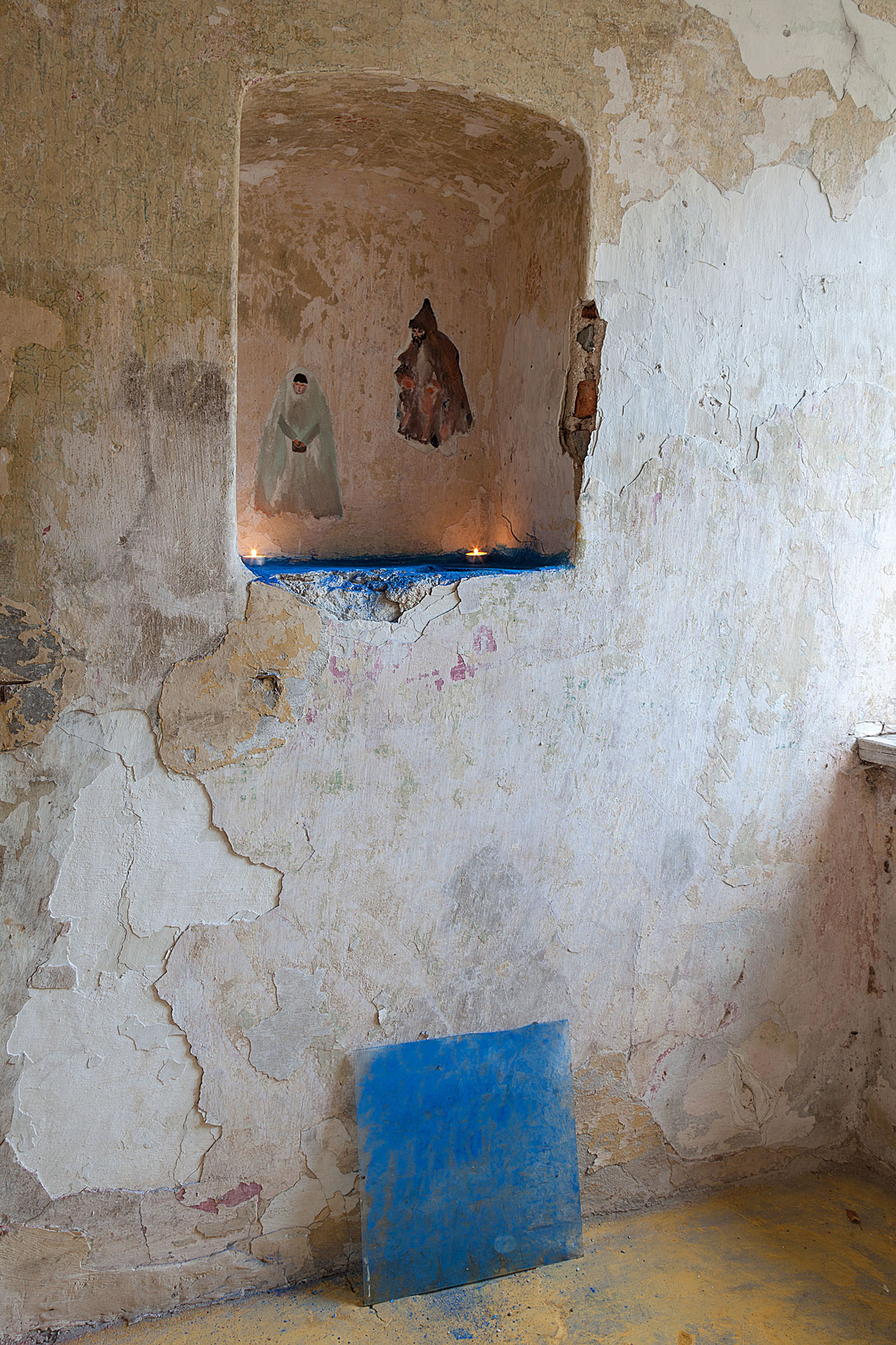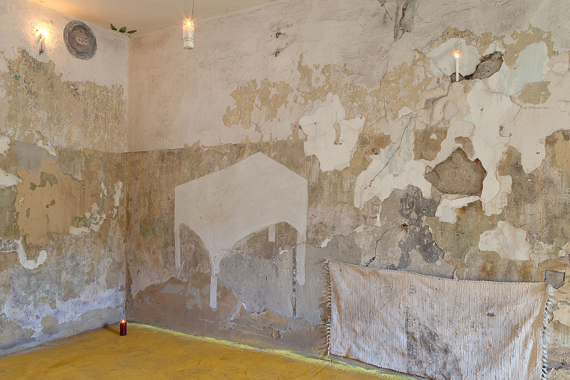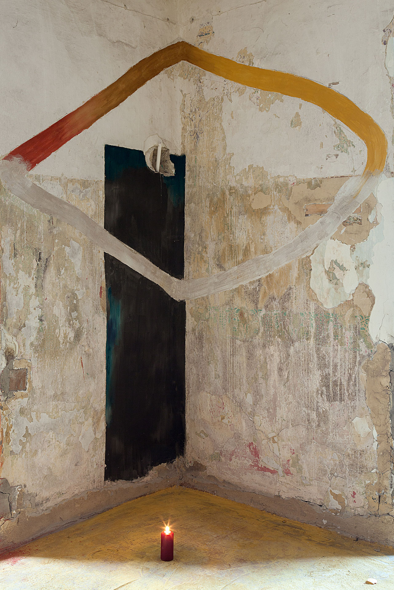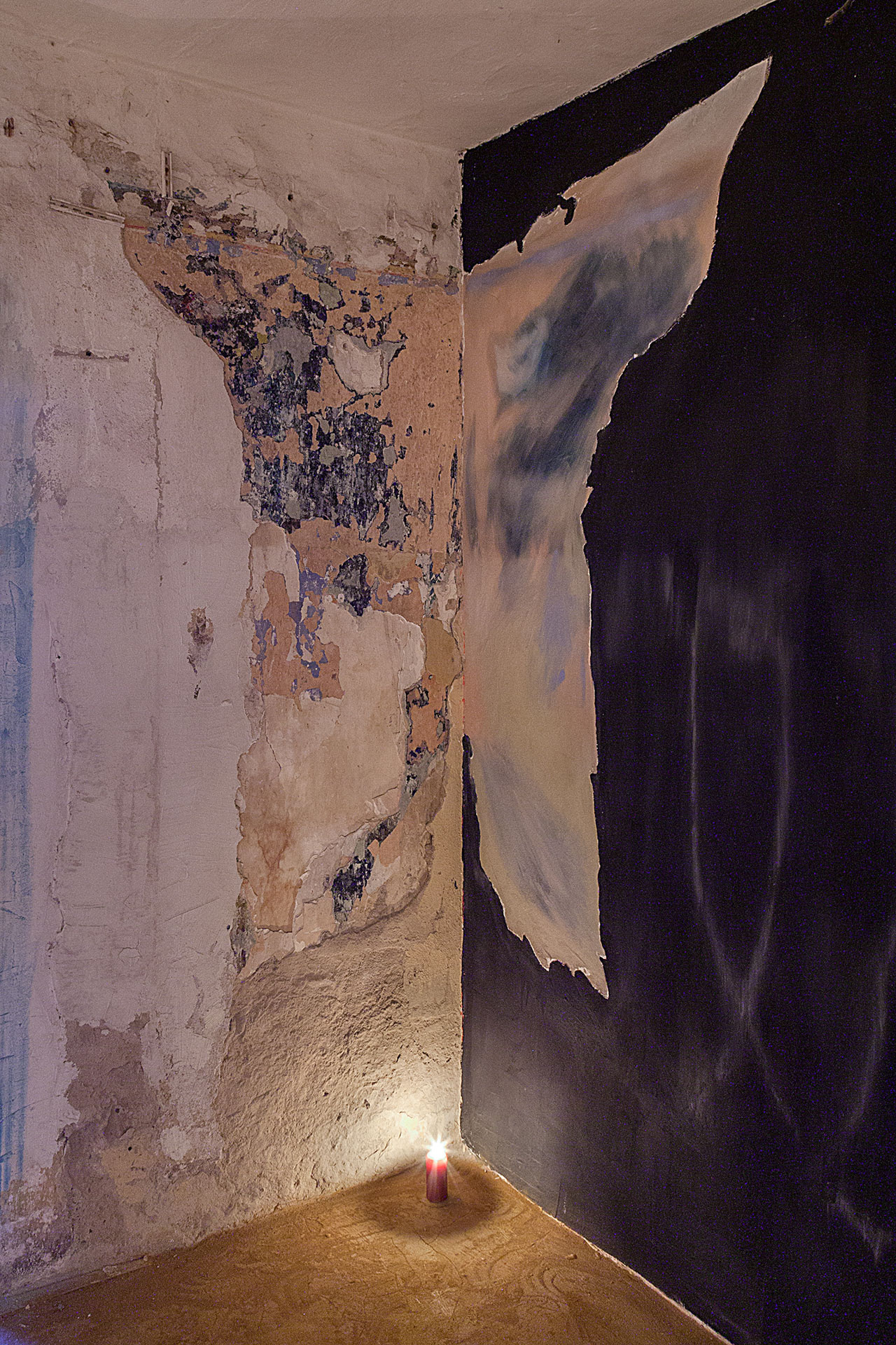 V rámci rezidenčního pobytu v Bánské Štiavnici jsme měly možnost zpracovat několik různých zchátralých domů. Mezi zbytky renesančních paláců nás nakonec (i svou rozumnou rozlohou) oslovila opuštěná budova bývalé strojovny. Nánosy historie, sypající se zdi a vybydlený prostor jsme využily pro drobné experimenty s omítkou, různé postupy vrstvení a proškrabávání i hru s pigmenty. Výzvou byla i práce s temnými tóny, většinou nepreferovanými do obytných prostor. Vernisážoví hosté viděli fresky ve světle svíček.