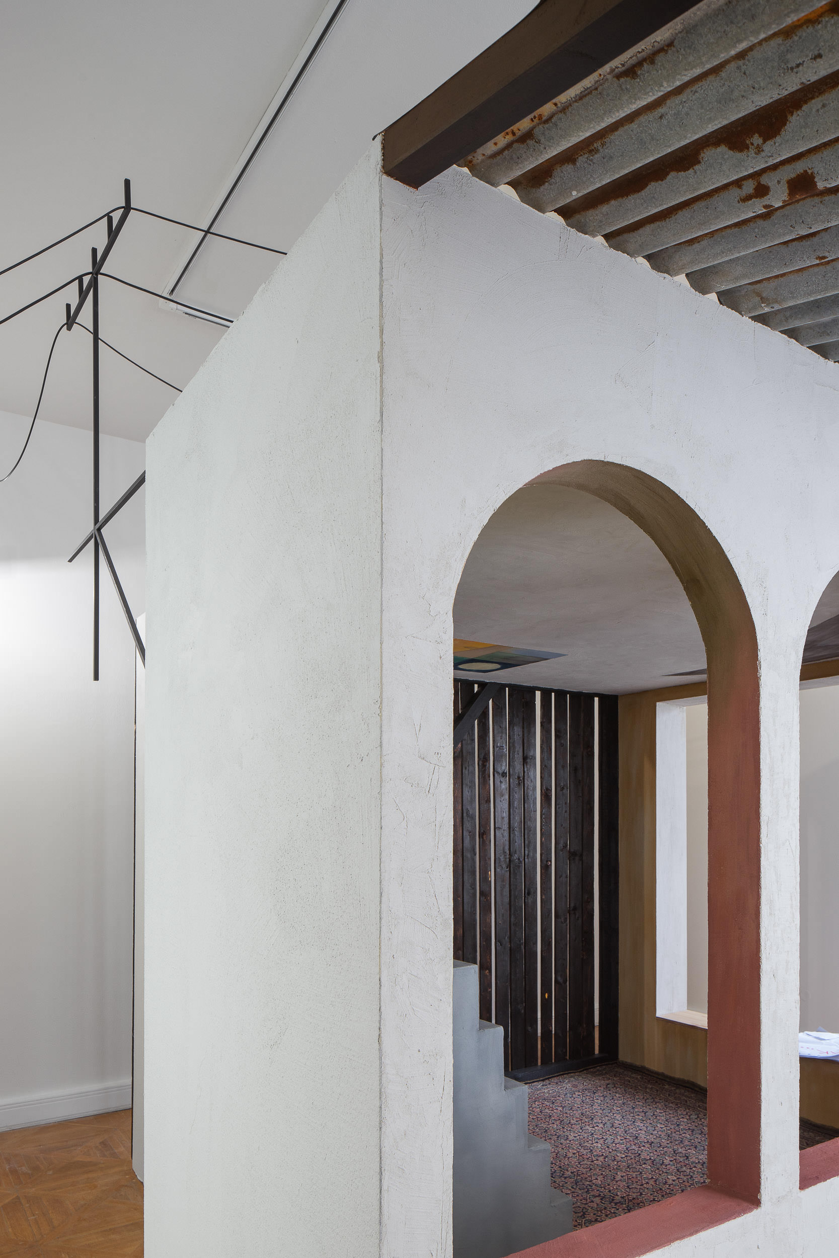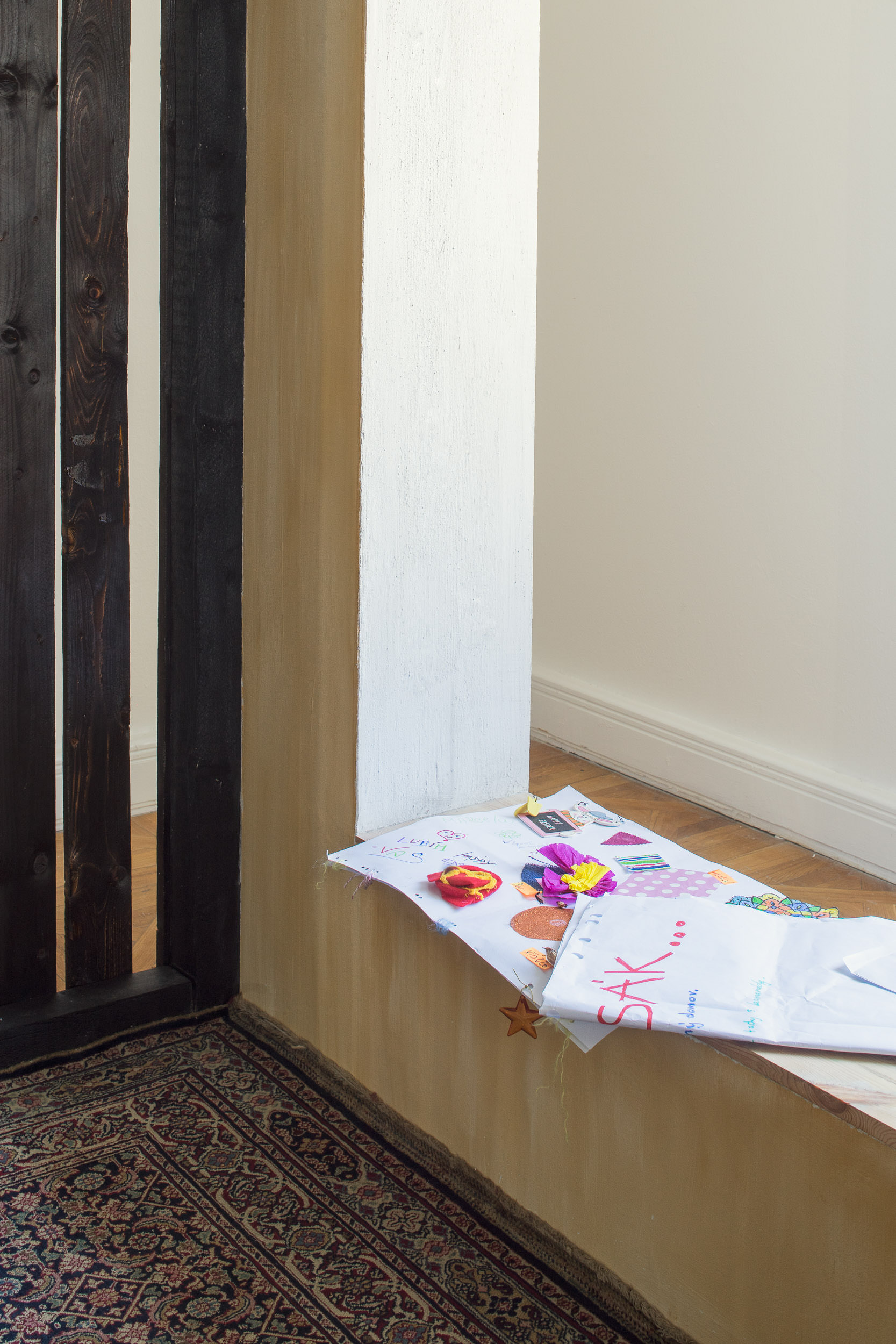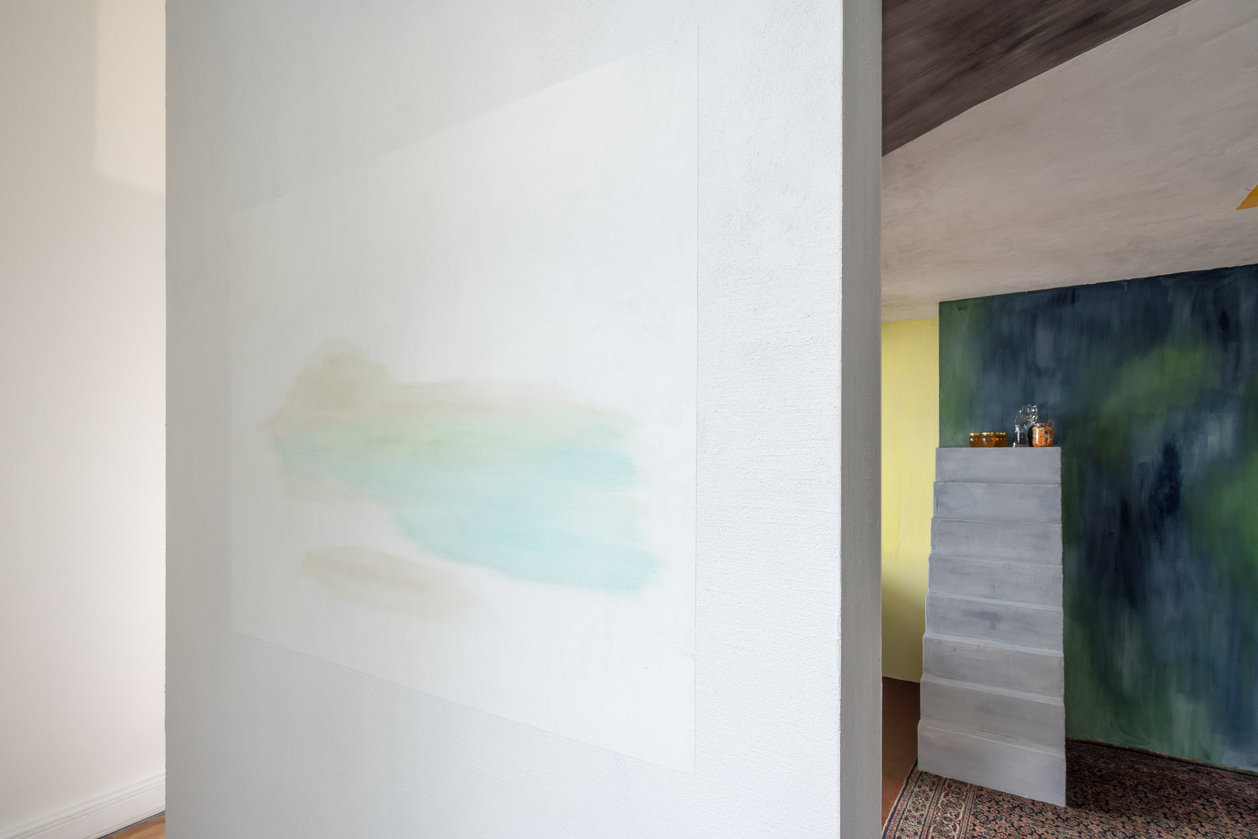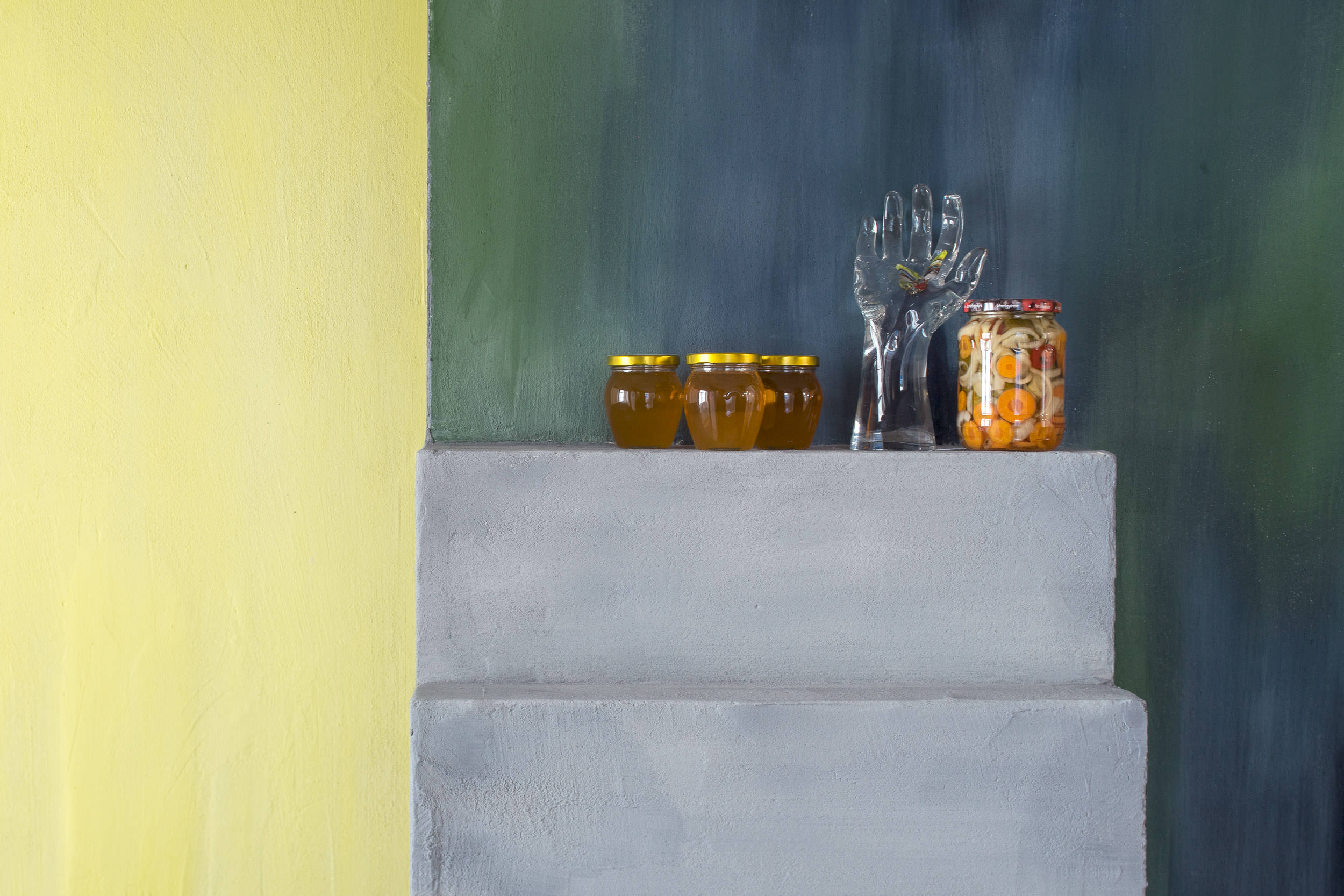 Do výstavy v Moravské galerii se darované fresky propsaly prostřednictvím darů, které jsme od institucí dostaly darem zpět – skleničky s medem, kresby, skleněná dlaň s motýlem, hodiny, co jdou pozadu, nakládané okurky. Ty jsme umístily do architektury, kterou jsme si za tímto účelem a účelem dalšího malování do výstavy navrhly. Architektura vycházela z prostorových možností přidělené místnosti a našich oblíbených architektonických prvků, jako jsou patio, oblouky, průhledy, věž, různé druhy stárnoucích materiálů. Stavbu jsme pokryly freskami, opáleným dřevem, starými cihlami a zrezlým vlnitým plechem. Oproti naší obvyklé praxi, kdy hledáme jak se s prostředím sžít, zachovat jeho specifičnost a prospět mu, jsme byly v naprosto opačné situaci. Navrhovaný prostor vznikal konkrétně pro fresky. Paradoxně o to těžší bylo do něj nakonec malovat. Ve výsledku jsme se snažily o atmosféru soumraku v garsonce na skále nad mořem v některé ze zemí kolem středozemního moře.