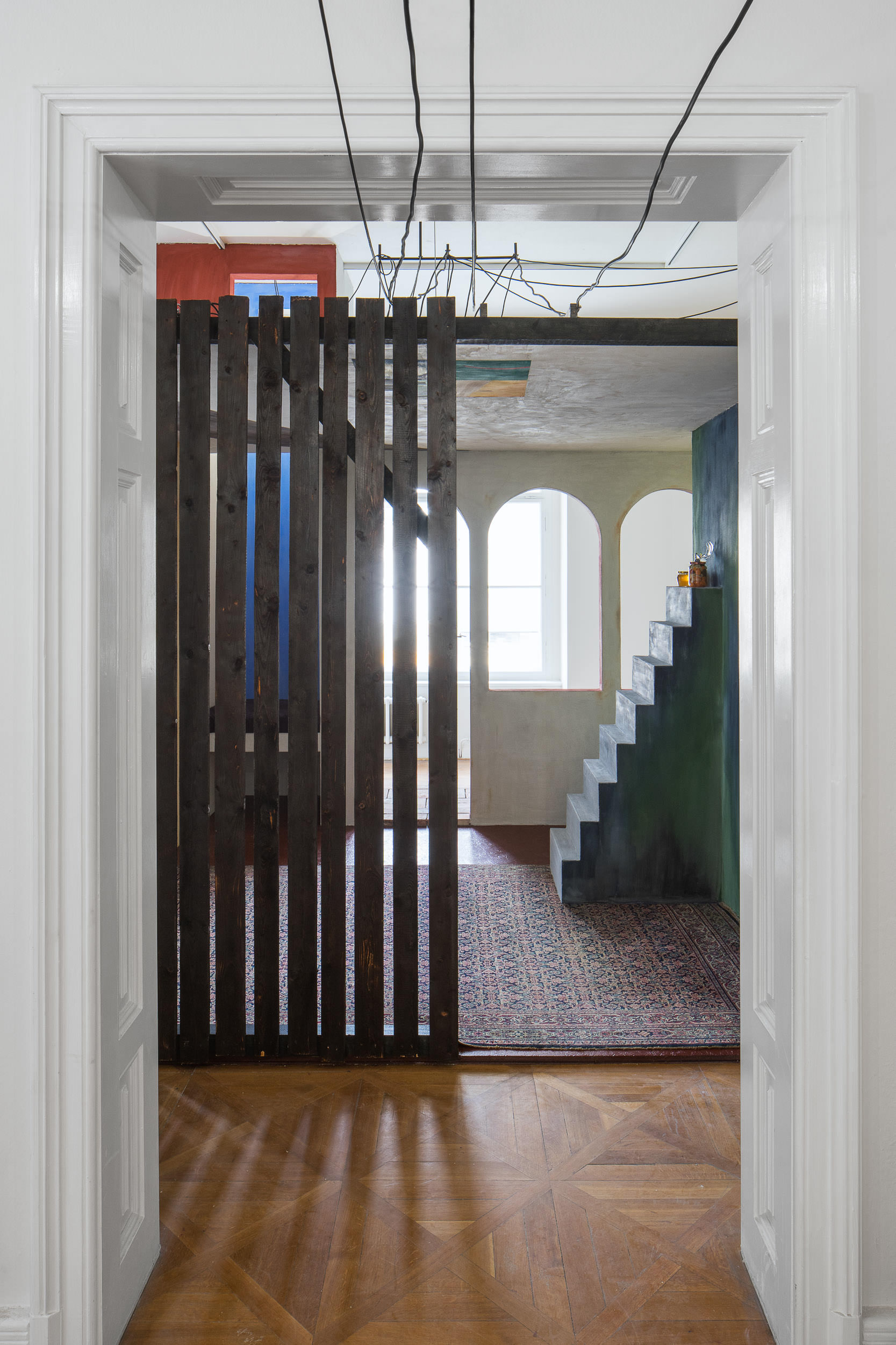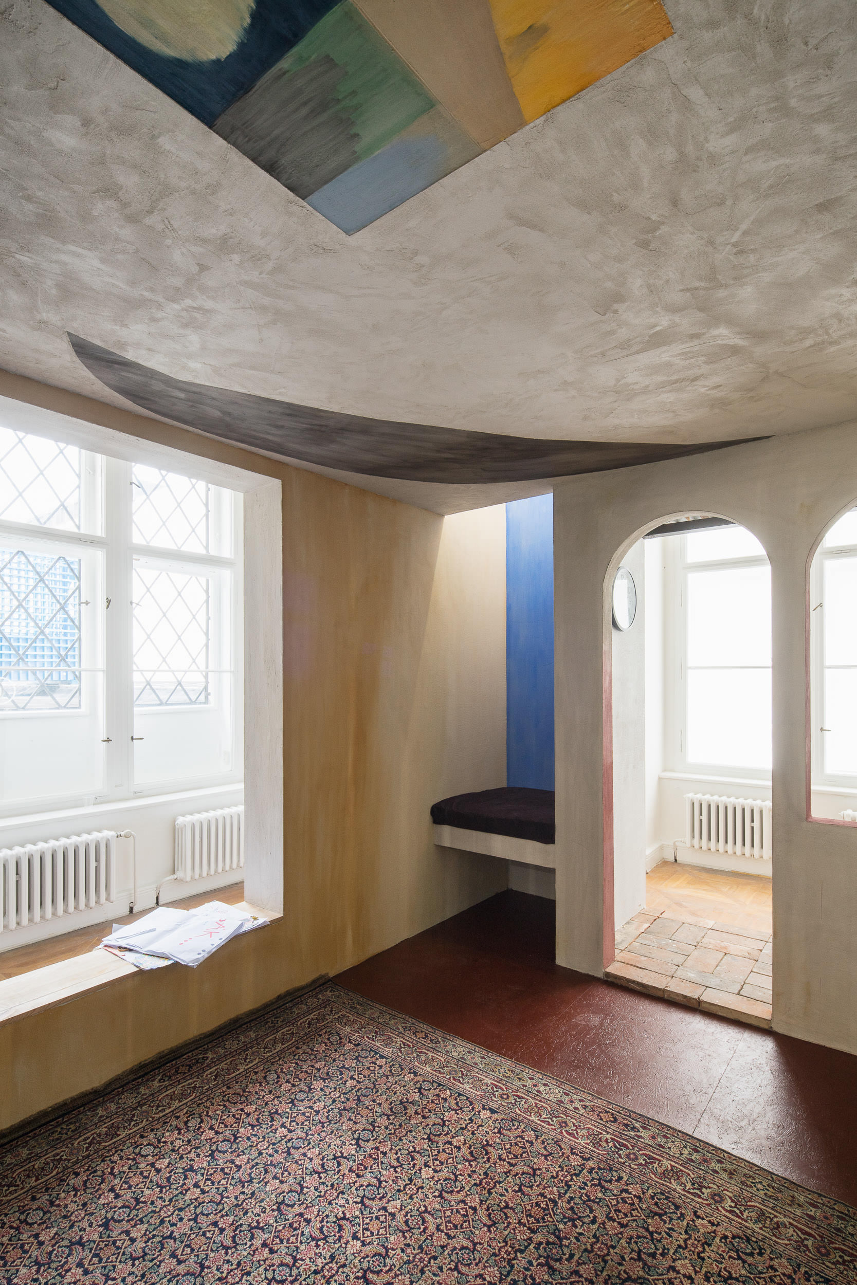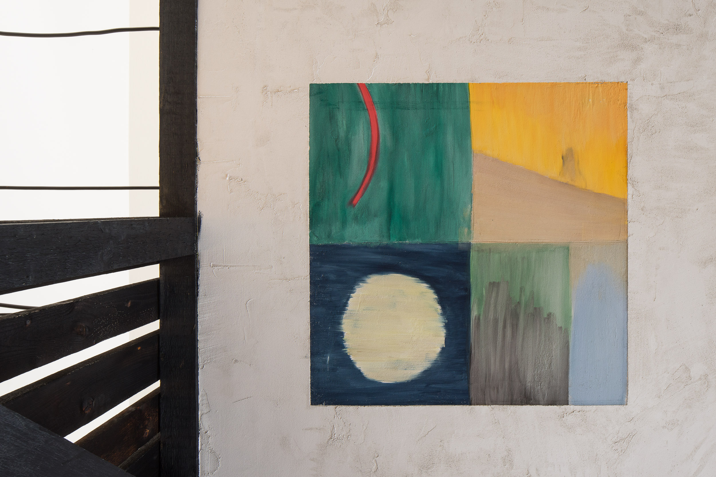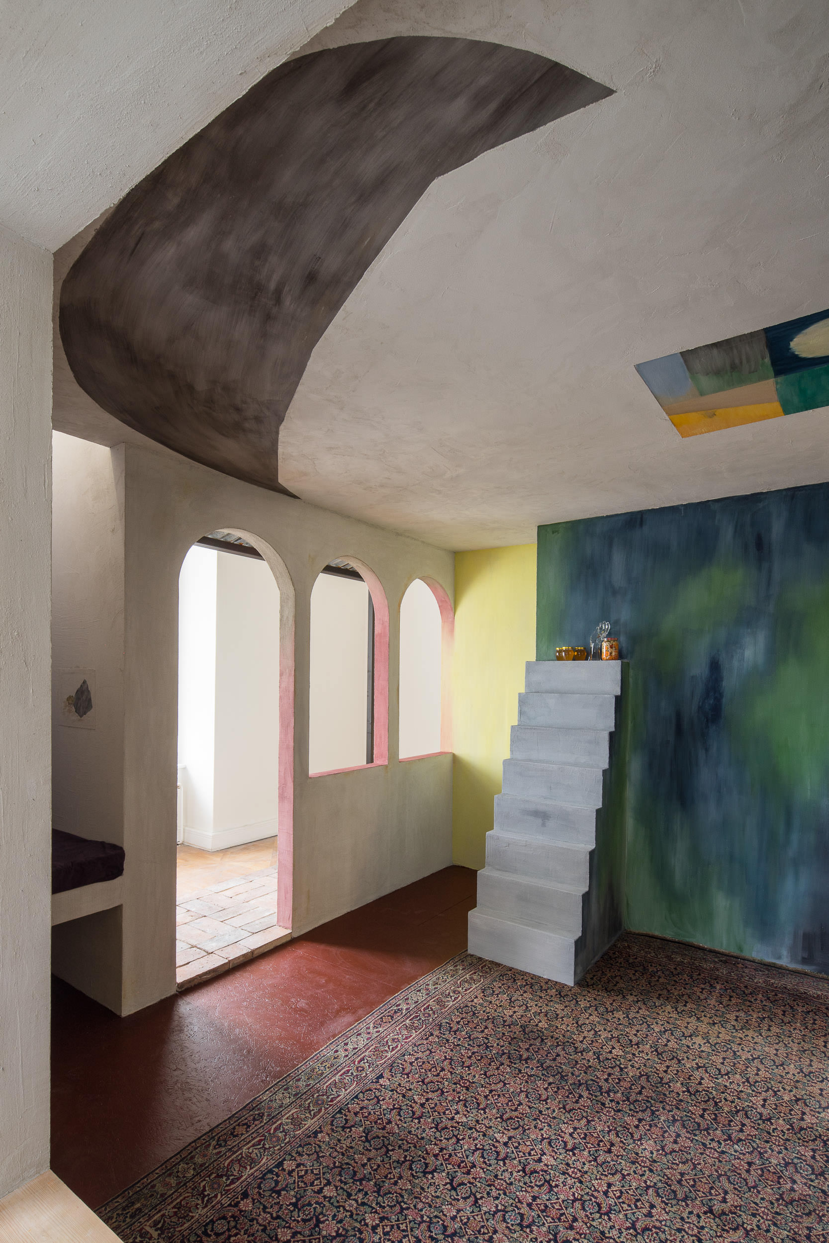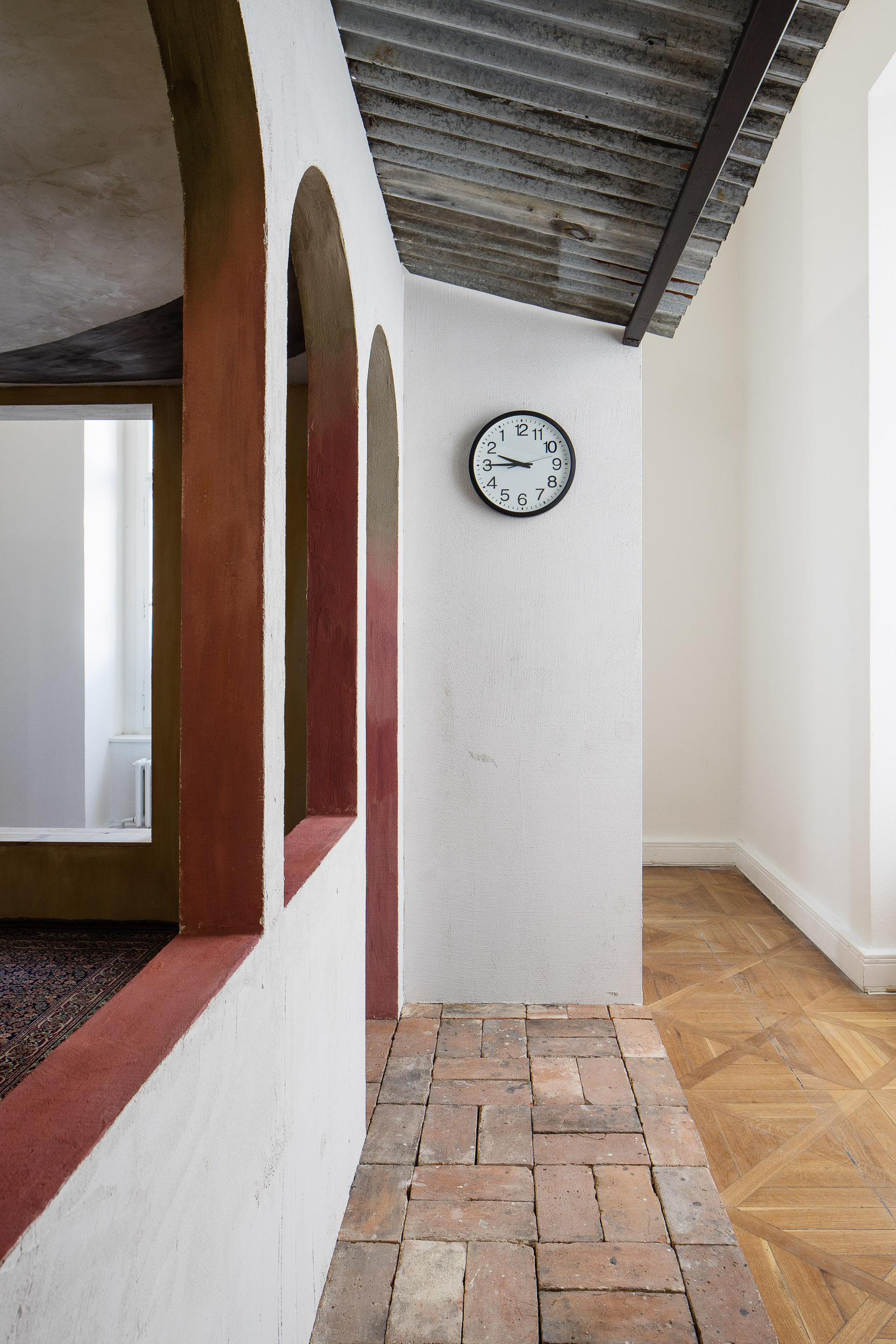 Do výstavy v Moravské galerii se darované fresky propsaly prostřednictvím darů, které jsme od institucí dostaly darem zpět – skleničky s medem, kresby, skleněná dlaň s motýlem, hodiny, co jdou pozadu, nakládané okurky. Ty jsme umístily do architektury, kterou jsme si za tímto účelem a účelem dalšího malování do výstavy navrhly. Architektura vycházela z prostorových možností přidělené místnosti a našich oblíbených architektonických prvků, jako jsou patio, oblouky, průhledy, věž, různé druhy stárnoucích materiálů. Stavbu jsme pokryly freskami, opáleným dřevem, starými cihlami a zrezlým vlnitým plechem. Oproti naší obvyklé praxi, kdy hledáme jak se s prostředím sžít, zachovat jeho specifičnost a prospět mu, jsme byly v naprosto opačné situaci. Navrhovaný prostor vznikal konkrétně pro fresky. Paradoxně o to těžší bylo do něj nakonec malovat. Ve výsledku jsme se snažily o atmosféru soumraku v garsonce na skále nad mořem v některé ze zemí kolem středozemního moře.
