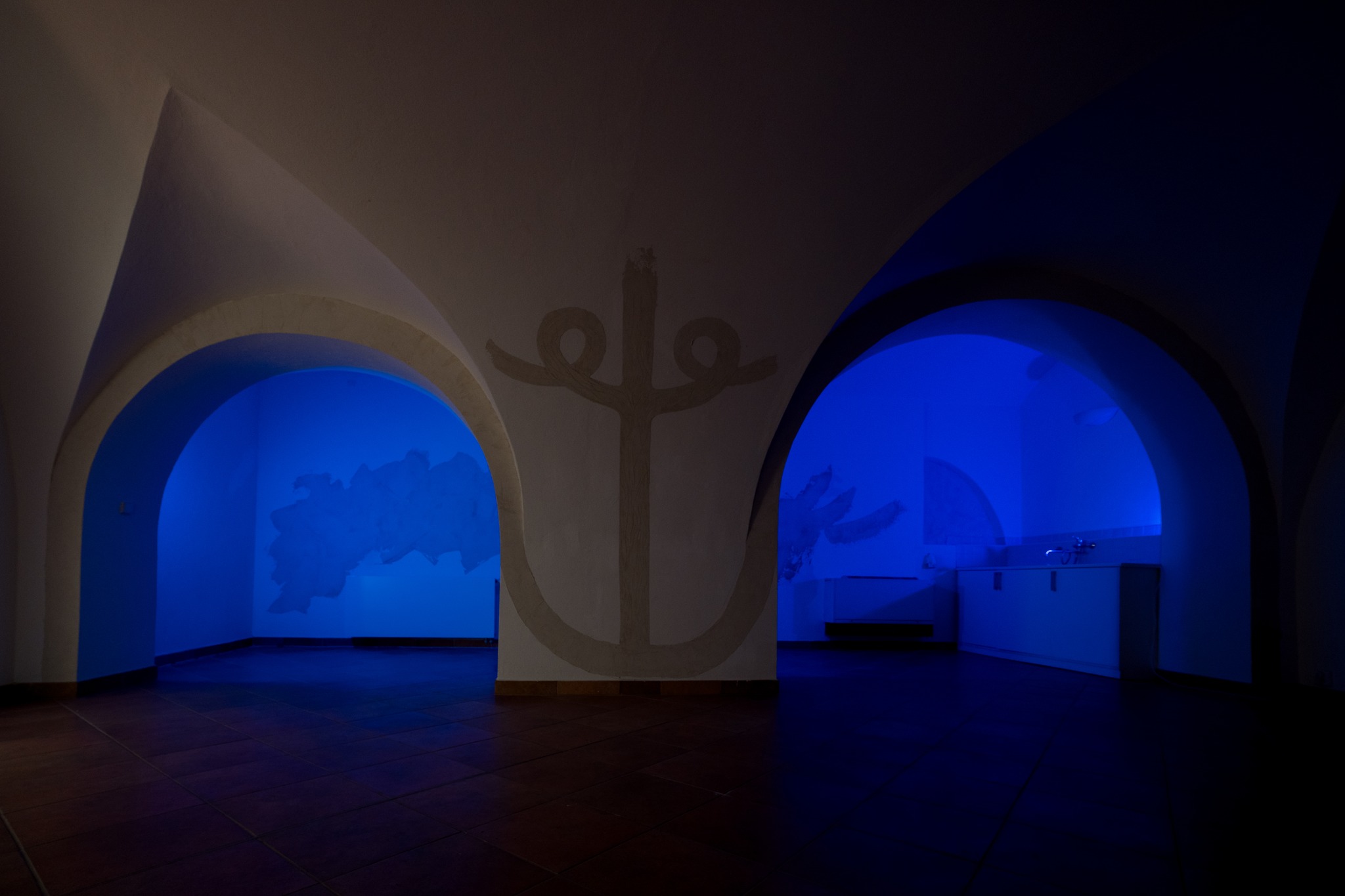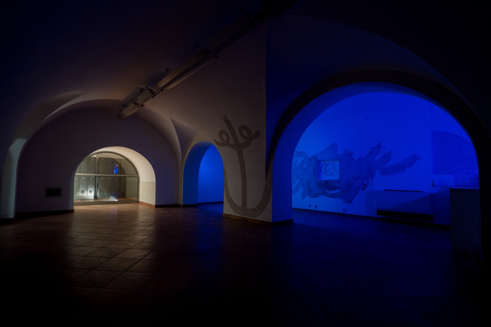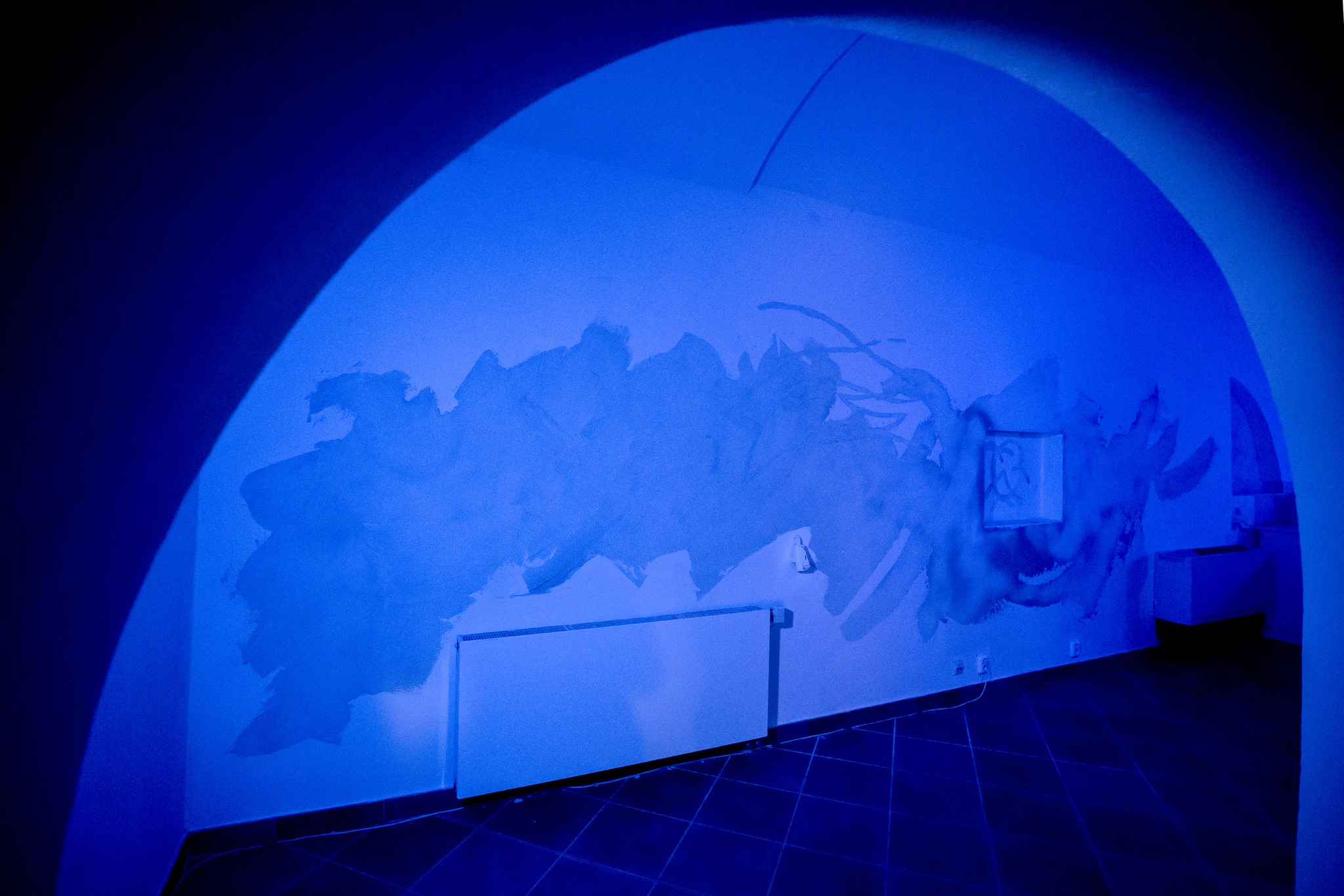 Galerie Basement v Olomouci je specifická absencí přirozeného světla. Prostor je to podzemní a poměrně nízkému stropu dominují klenby a členitost. Přistoupily jsme na hru potemnění a rozhodly se navodit atmosféru modrého zasněného světla v kombinaci s čistě štukovou malbou. Možnost mít výstavu jsme tedy obrátily v experiment s nepoužitím ani jednoho barevného pigmentu, což se stalo v této realizaci poprvé. Barvy jsou svůdné a tak jsme rády, že nám formát výstavy nabídl možnost na chvíli je opustit a zůstat u třpytivosti šedo-bílého štuku.