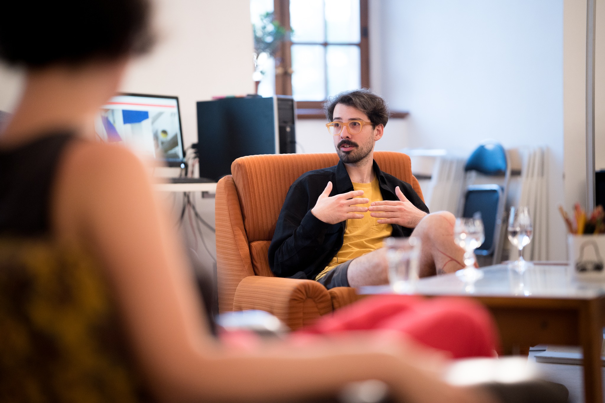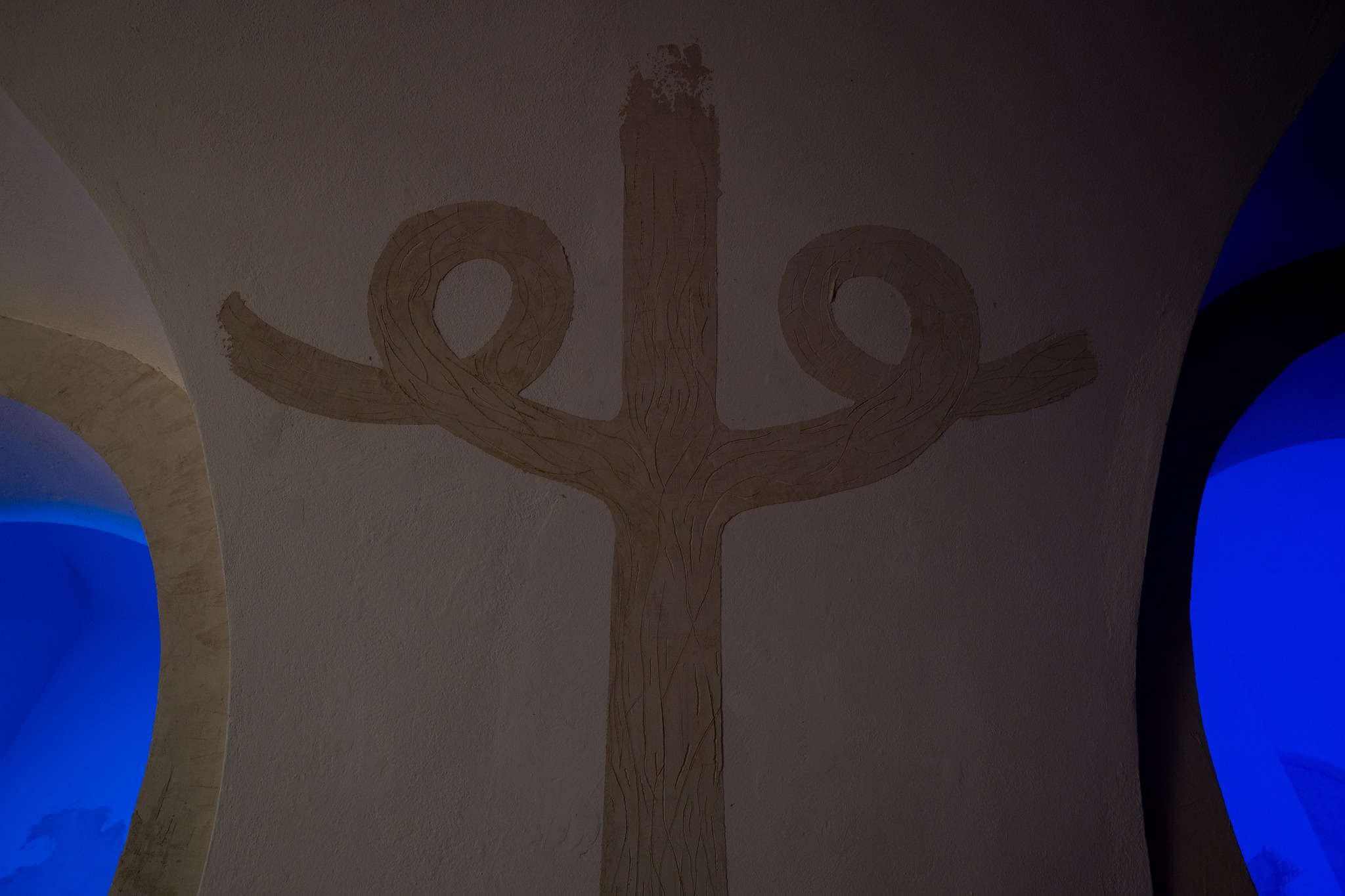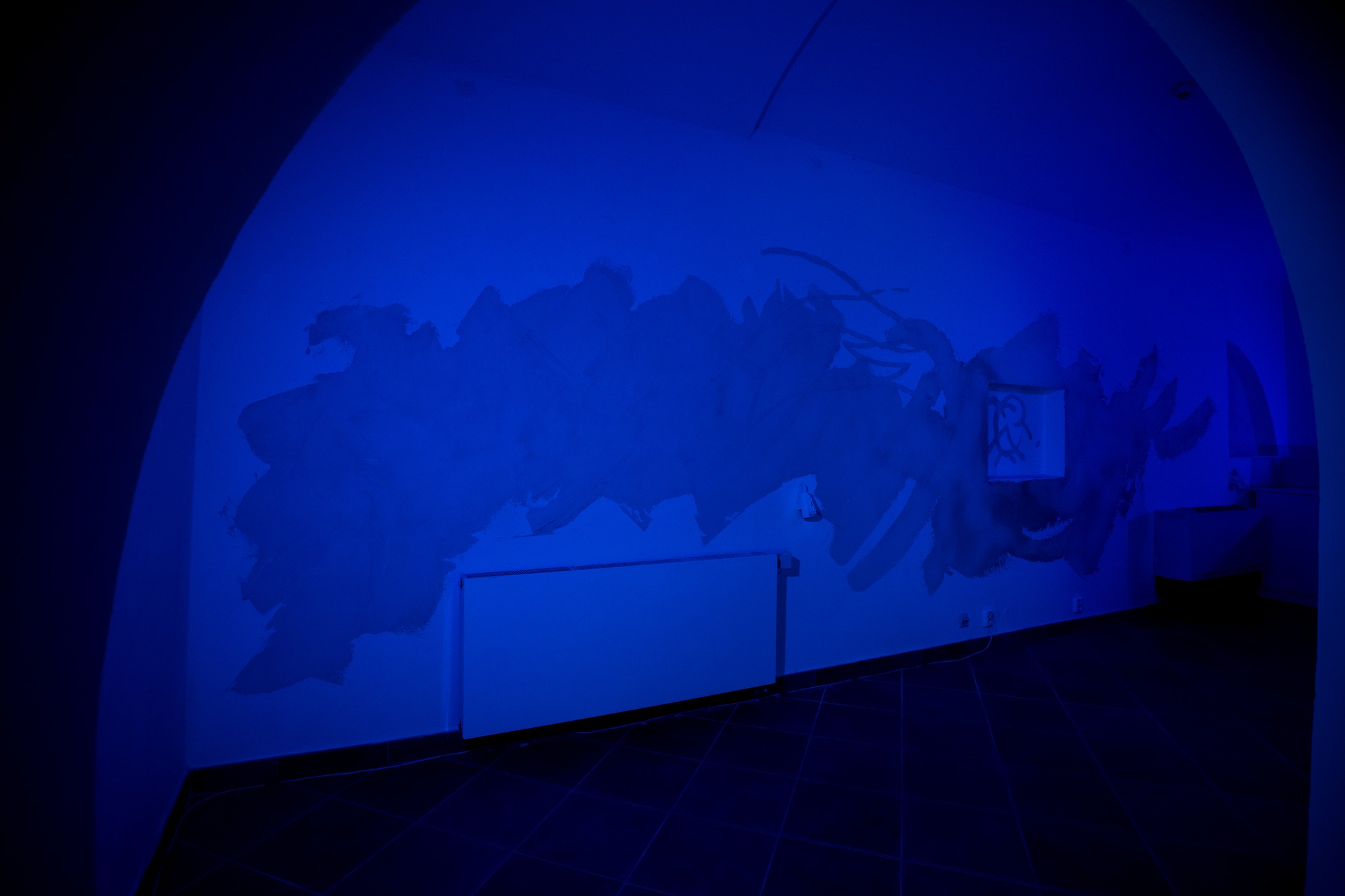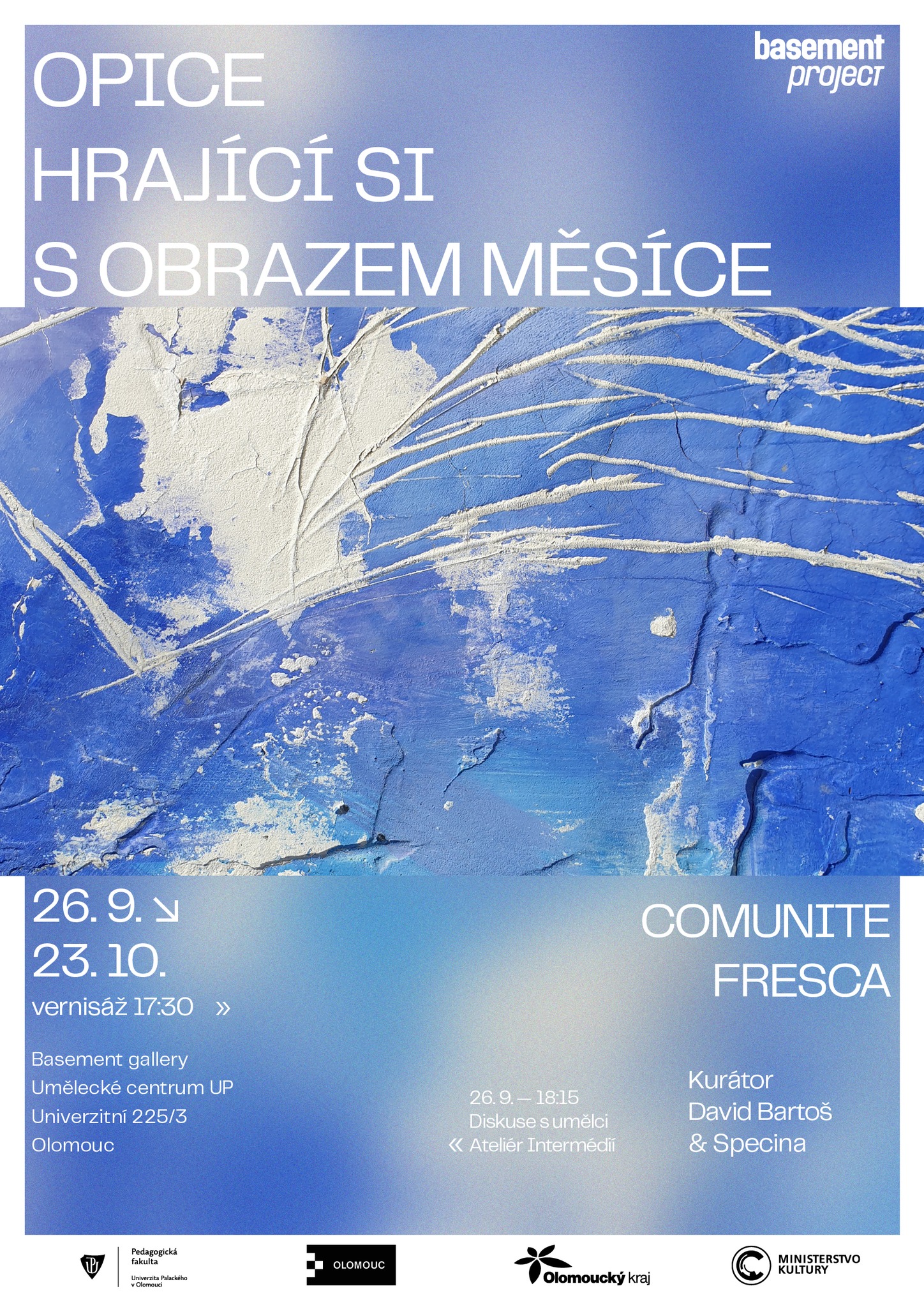 Galerie Basement v Olomouci je specifická absencí přirozeného světla. Prostor je to podzemní a poměrně nízkému stropu dominují klenby a členitost. Přistoupily jsme na hru potemnění a rozhodly se navodit atmosféru modrého zasněného světla v kombinaci s čistě štukovou malbou. Možnost mít výstavu jsme tedy obrátily v experiment s nepoužitím ani jednoho barevného pigmentu, což se stalo v této realizaci poprvé. Barvy jsou svůdné a tak jsme rády, že nám formát výstavy nabídl možnost na chvíli je opustit a zůstat u třpytivosti šedo-bílého štuku.