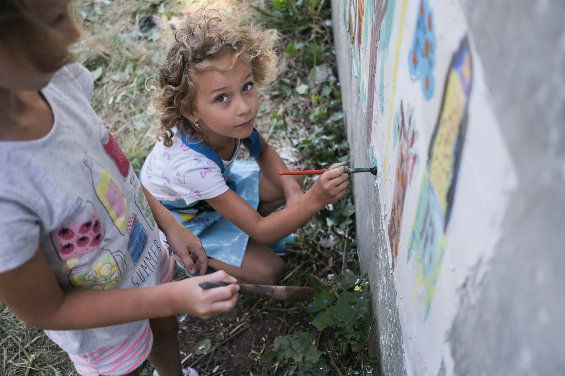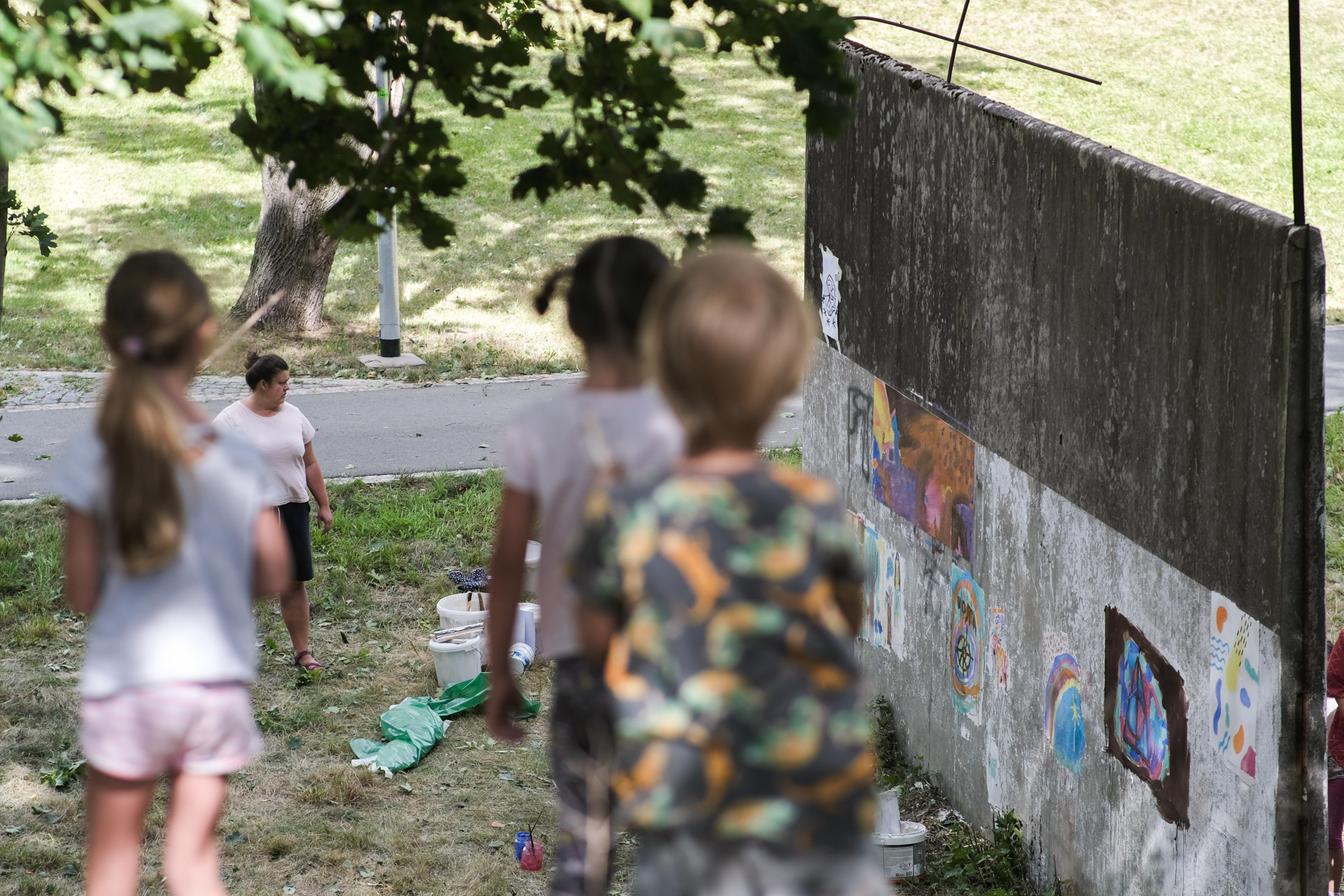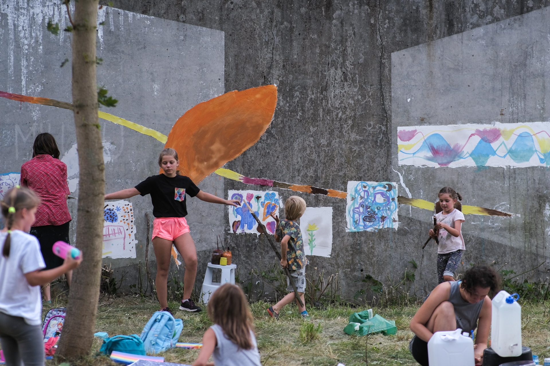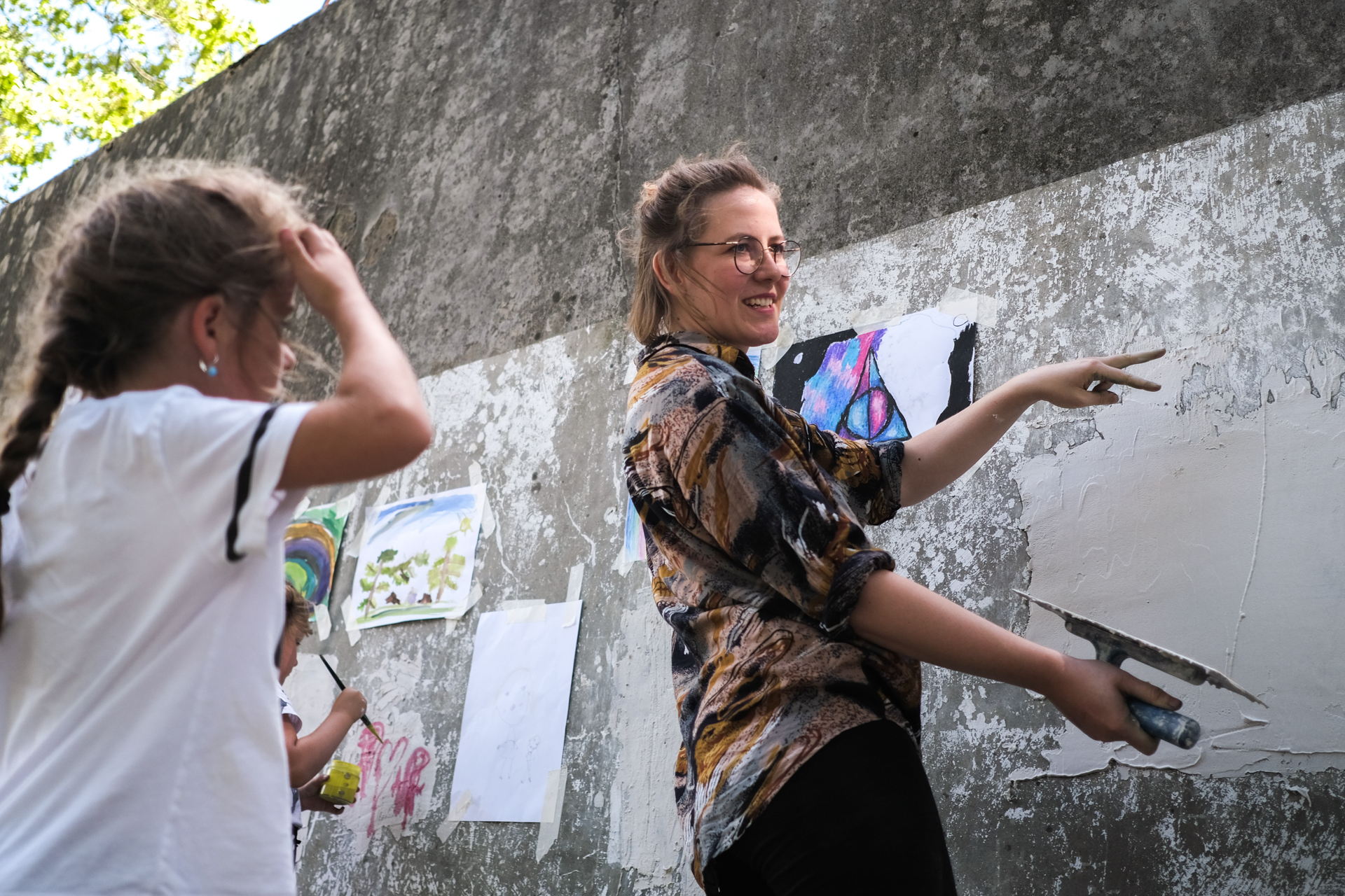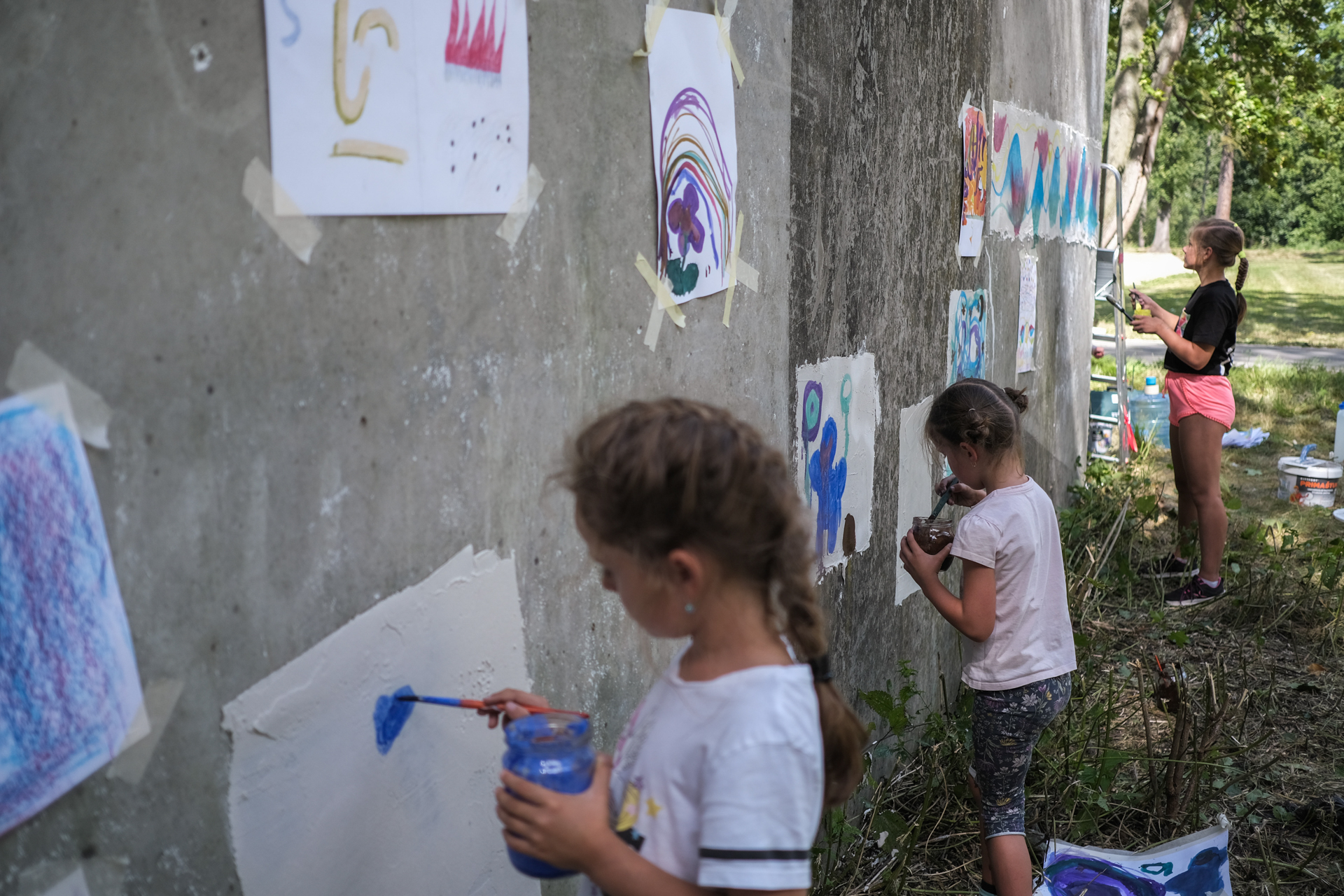 Workshop proběhl v rámci příměstského tábora pro děti ve věku 5-14 let, který organizovala GAMPA jako rozšíření Festivalu Tvárnost paměti. Společná freska vznikala během jednoho dne v Pardubicích na opuštěné zdi poblíž cyklostezky. Skicovali jsme za hezkého počasí v plenéru. Děti si v příjemném stínu rozmíchaly barevné pigmenty a vyzkoušely si práci se zednickými natahováky i špachtlemi. Výsledná malba je pestrá na motivy i barvy a je dále zanechána venkovním podmínkám i zubu času.