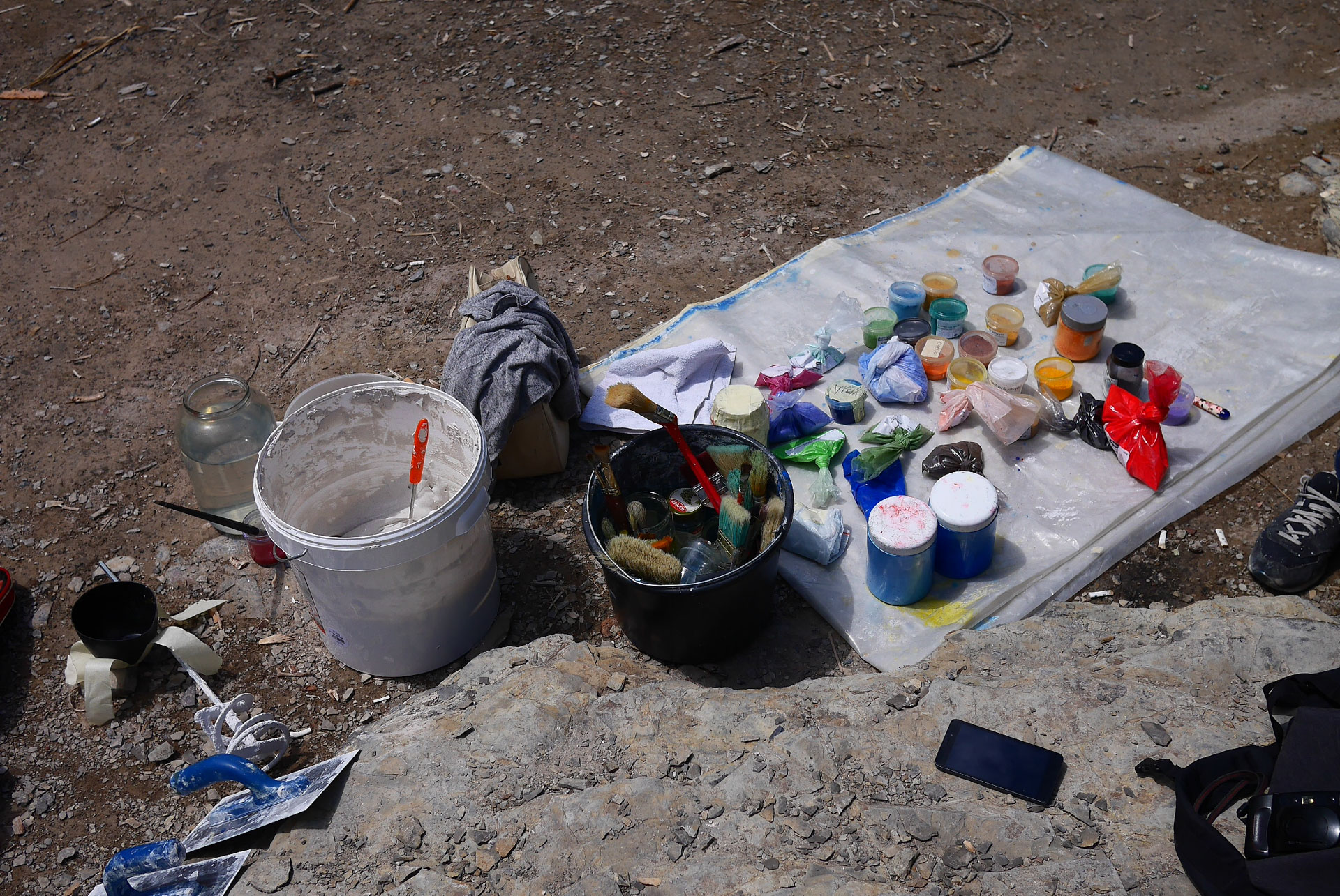Fresku do výstavy, která byla z větší části postavená na procházkách, výletech a setkáních s divokostí přírody, jsme situovaly do skalního lomu Hády v Brně. Malovaly jsme zde na kusy kamene, fragmenty map, symbolů a náznaků, které dál v čase a pod nátlakem počasí mizely.