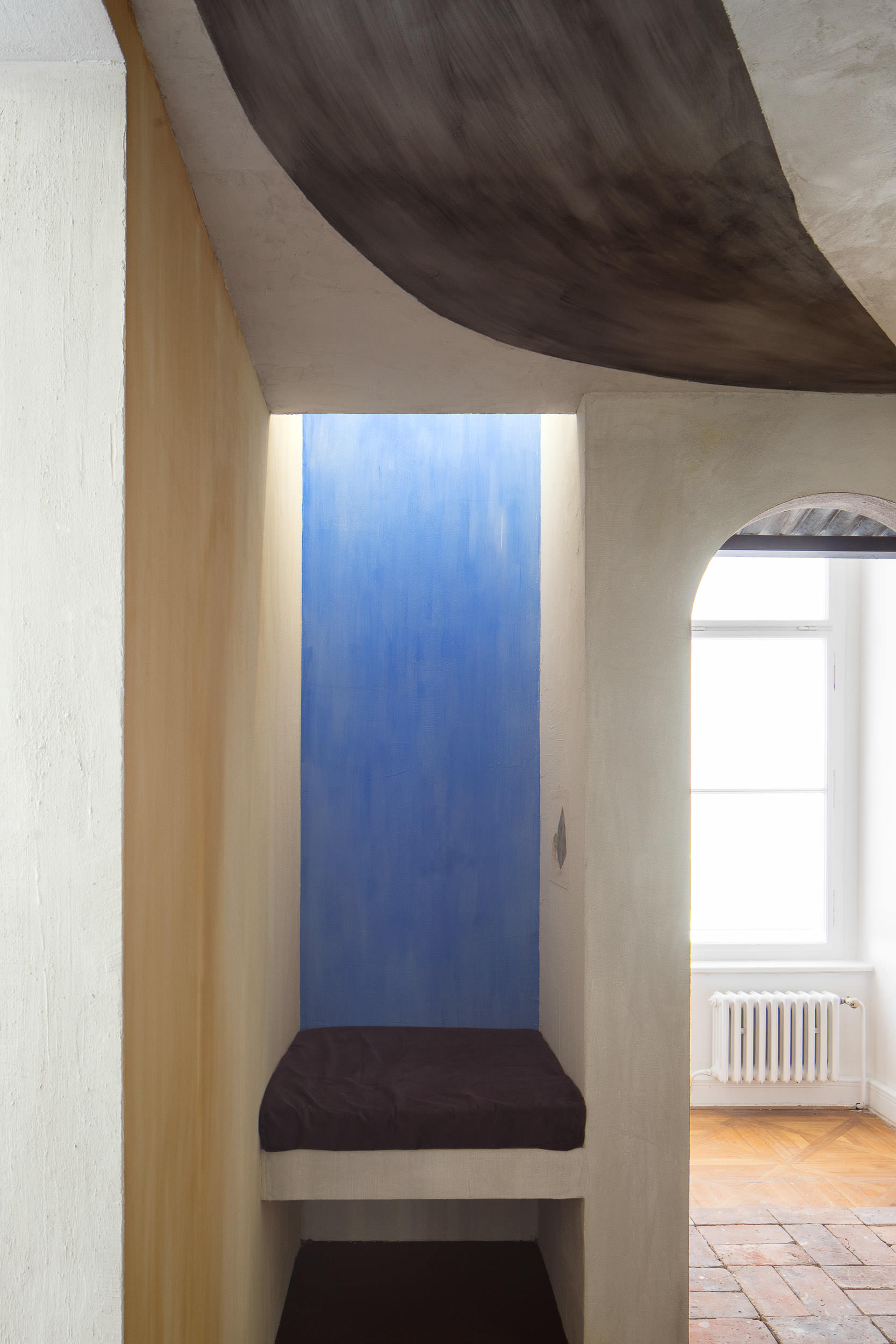 Do výstavy v Moravské galerii se darované fresky propsaly prostřednictvím darů, které jsme od institucí dostaly darem zpět – skleničky s medem, kresby, skleněná dlaň s motýlem, hodiny, co jdou pozadu, nakládané okurky. Ty jsme umístily do architektury, kterou jsme si za tímto účelem a účelem dalšího malování do výstavy navrhly. Architektura vycházela z prostorových možností přidělené místnosti a našich oblíbených architektonických prvků, jako jsou patio, oblouky, průhledy, věž, různé druhy stárnoucích materiálů. Stavbu jsme pokryly freskami, opáleným dřevem, starými cihlami a zrezlým vlnitým plechem. Oproti naší obvyklé praxi, kdy hledáme jak se s prostředím sžít, zachovat jeho specifičnost a prospět mu, jsme byly v naprosto opačné situaci. Navrhovaný prostor vznikal konkrétně pro fresky. Paradoxně o to těžší bylo do něj nakonec malovat. Ve výsledku jsme se snažily o atmosféru soumraku v garsonce na skále nad mořem v některé ze zemí kolem středozemního moře.