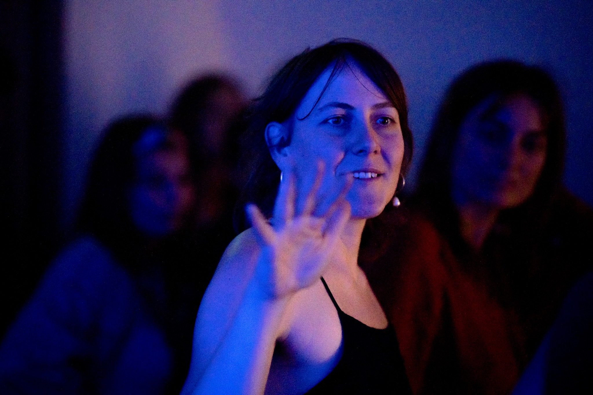 Galerie Basement v Olomouci je specifická absencí přirozeného světla. Prostor je to podzemní a poměrně nízkému stropu dominují klenby a členitost. Přistoupily jsme na hru potemnění a rozhodly se navodit atmosféru modrého zasněného světla v kombinaci s čistě štukovou malbou. Možnost mít výstavu jsme tedy obrátily v experiment s nepoužitím ani jednoho barevného pigmentu, což se stalo v této realizaci poprvé. Barvy jsou svůdné a tak jsme rády, že nám formát výstavy nabídl možnost na chvíli je opustit a zůstat u třpytivosti šedo-bílého štuku.